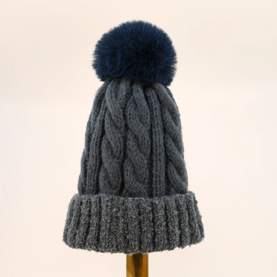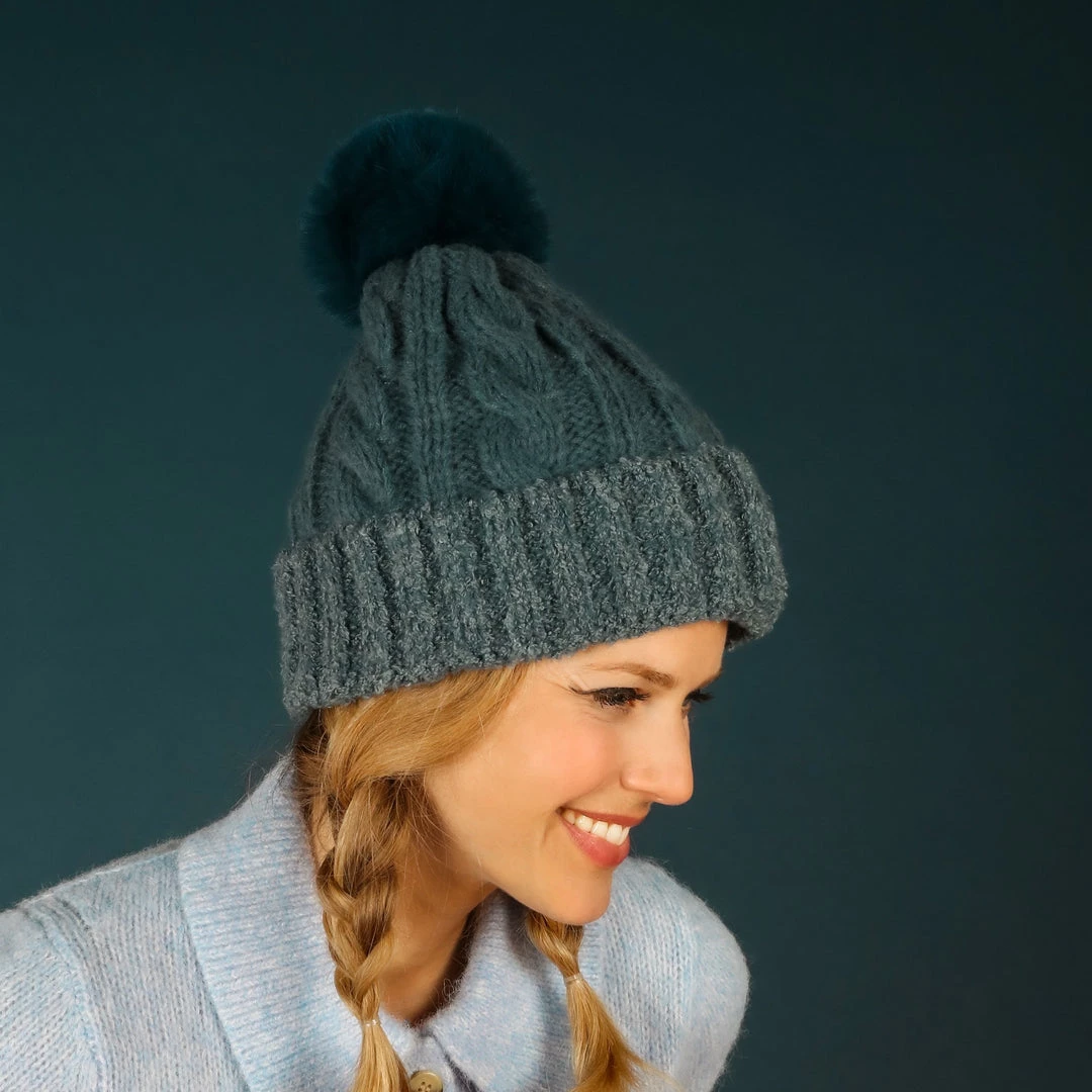 Super Cosy Bobble Hat in Denim Blue. Mix it up with a hat full of warm textures – this chunky knit Hat will have you feeling warm and fuzzy in no time! The cool denim colourway is classic. Comes with complimentary gift packaging.