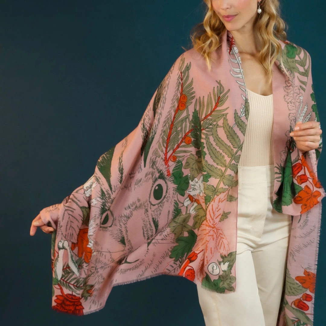 Happy Hare Pink Scarf. Large, soft and beautiful with a soft pink background this scarf featuring a happy hare is sure to bring a smile to the wearer’s face. Comes with complimentary gift packaging.