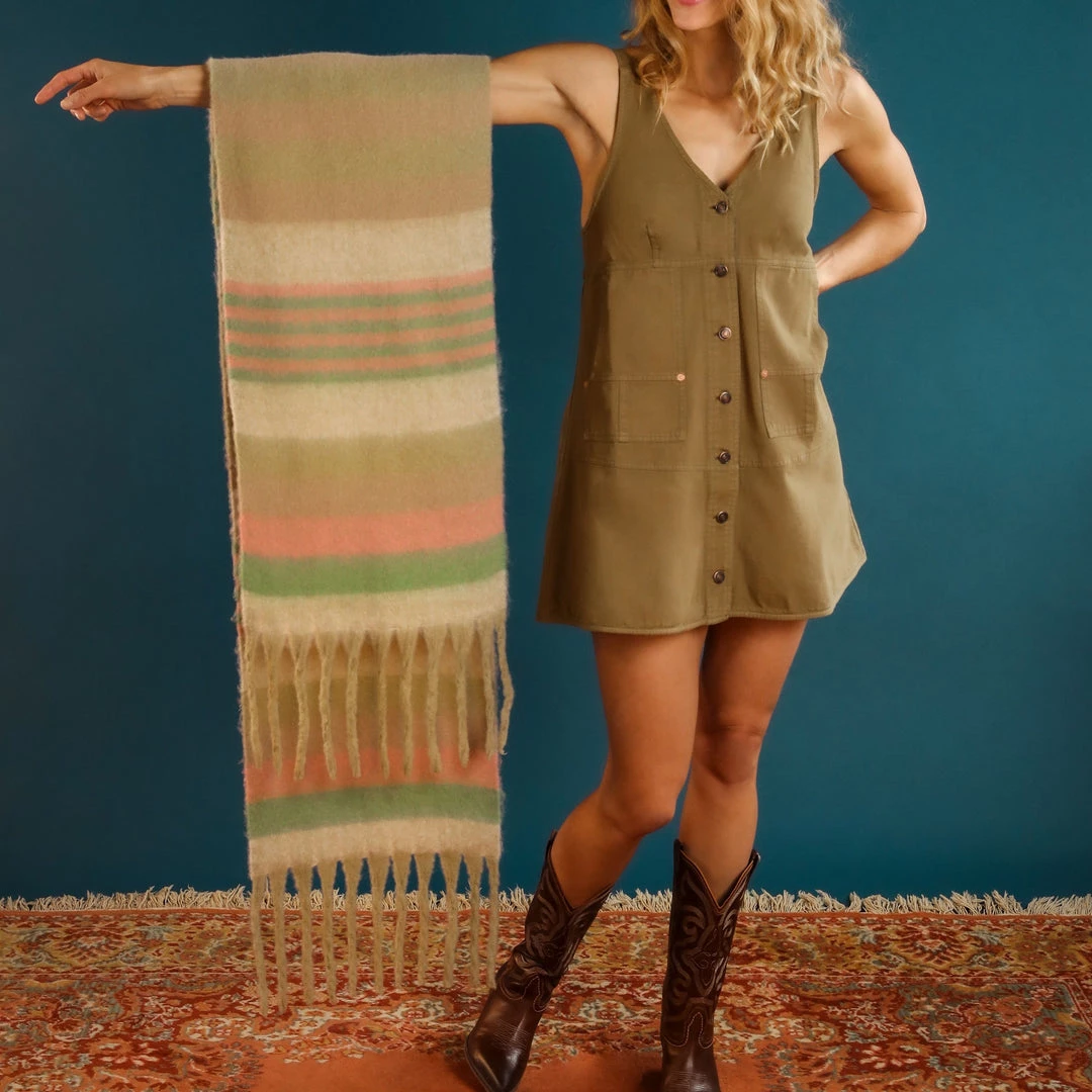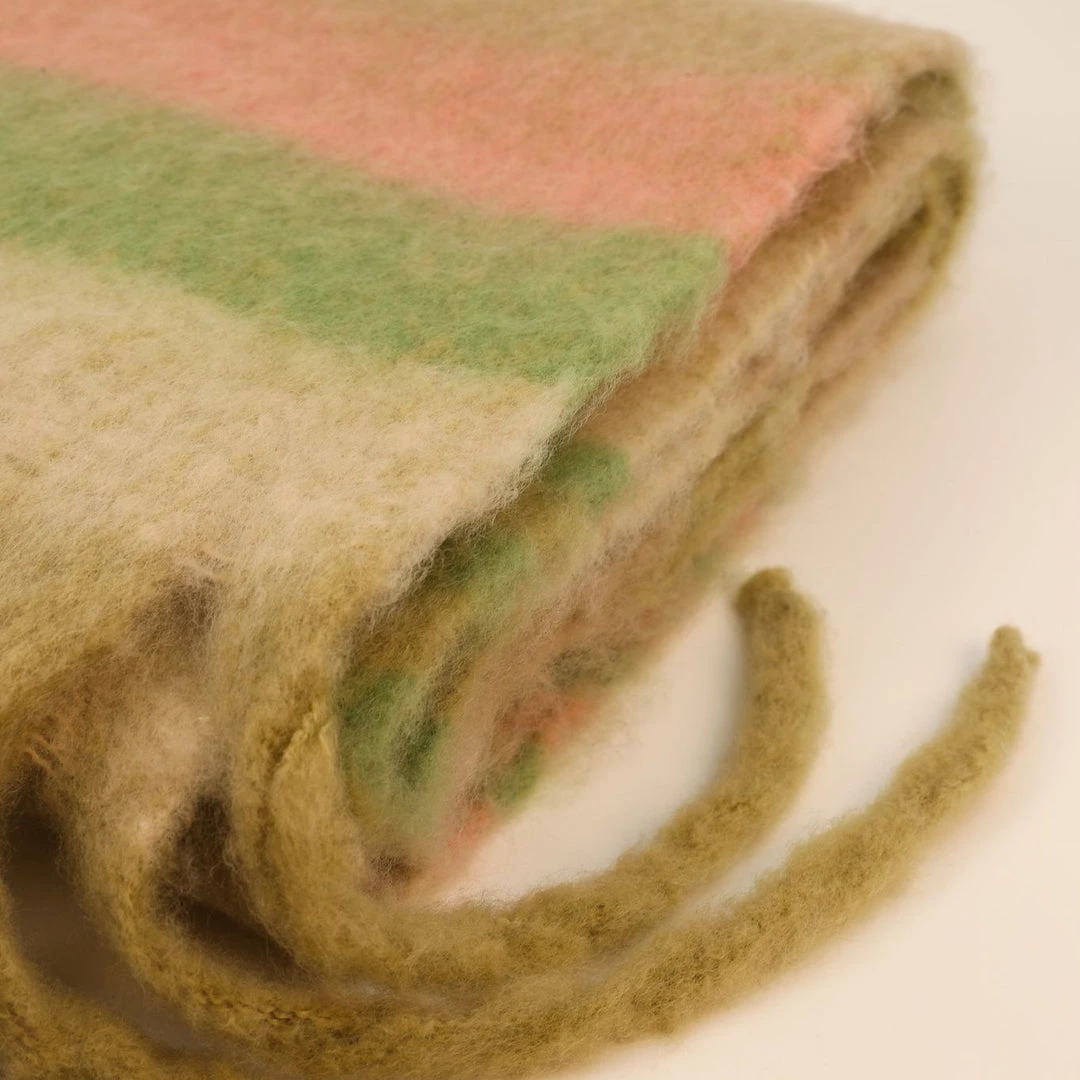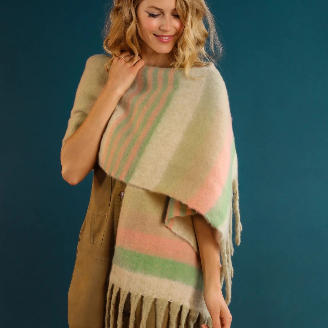 Chunky Tassel Scarf in Pastel Stripe. Super soft, long, woven scarf in soft pastel shades of beige, pink and green with long, squishy tassels. This is a great statement scarf that will keep you snug and warm this winter. It’s also long enough to use as a cosy bed runner when you are not wearing it. Comes with complimentary Gift Bag.