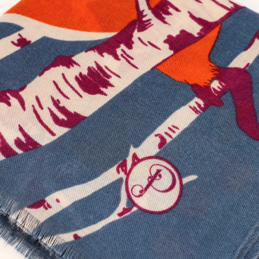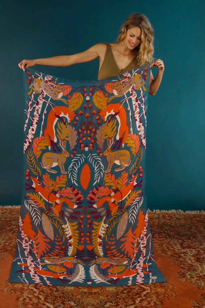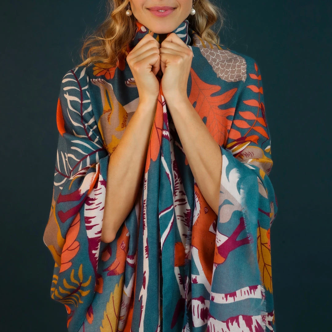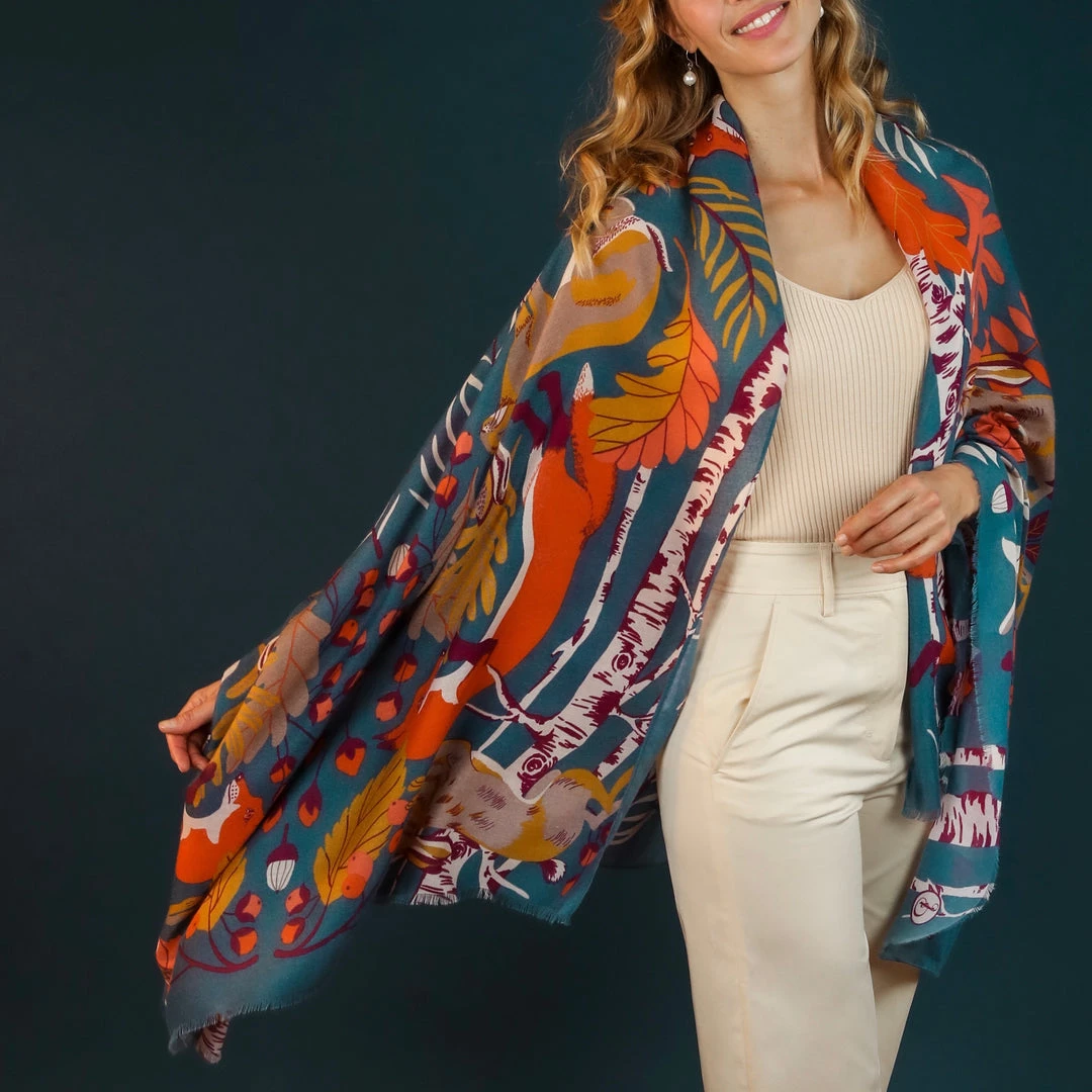 Woodland Kingdom Scarf. Large, soft and beautiful, this sophisticated Woodland Kingdom Print Scarf, which includes a gloriously Autumnal palette on a blue background, is perfect for crisp strolls along leafy paths. Comes with complimentary gift packaging.