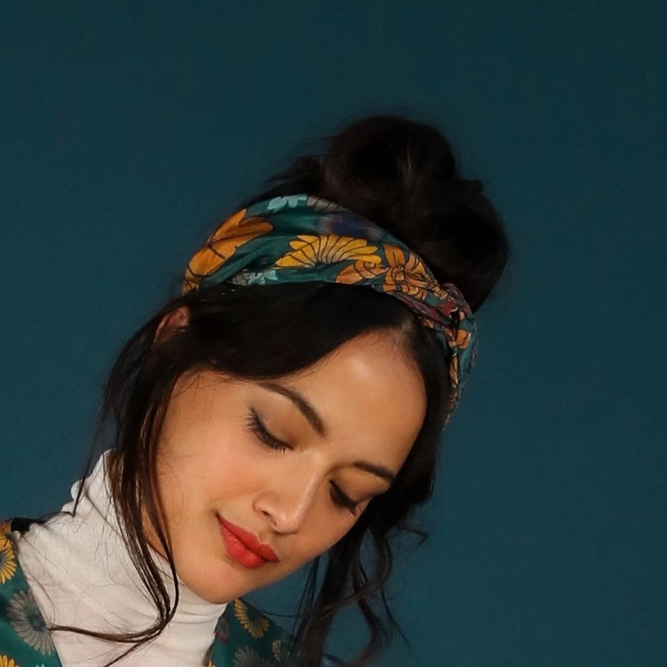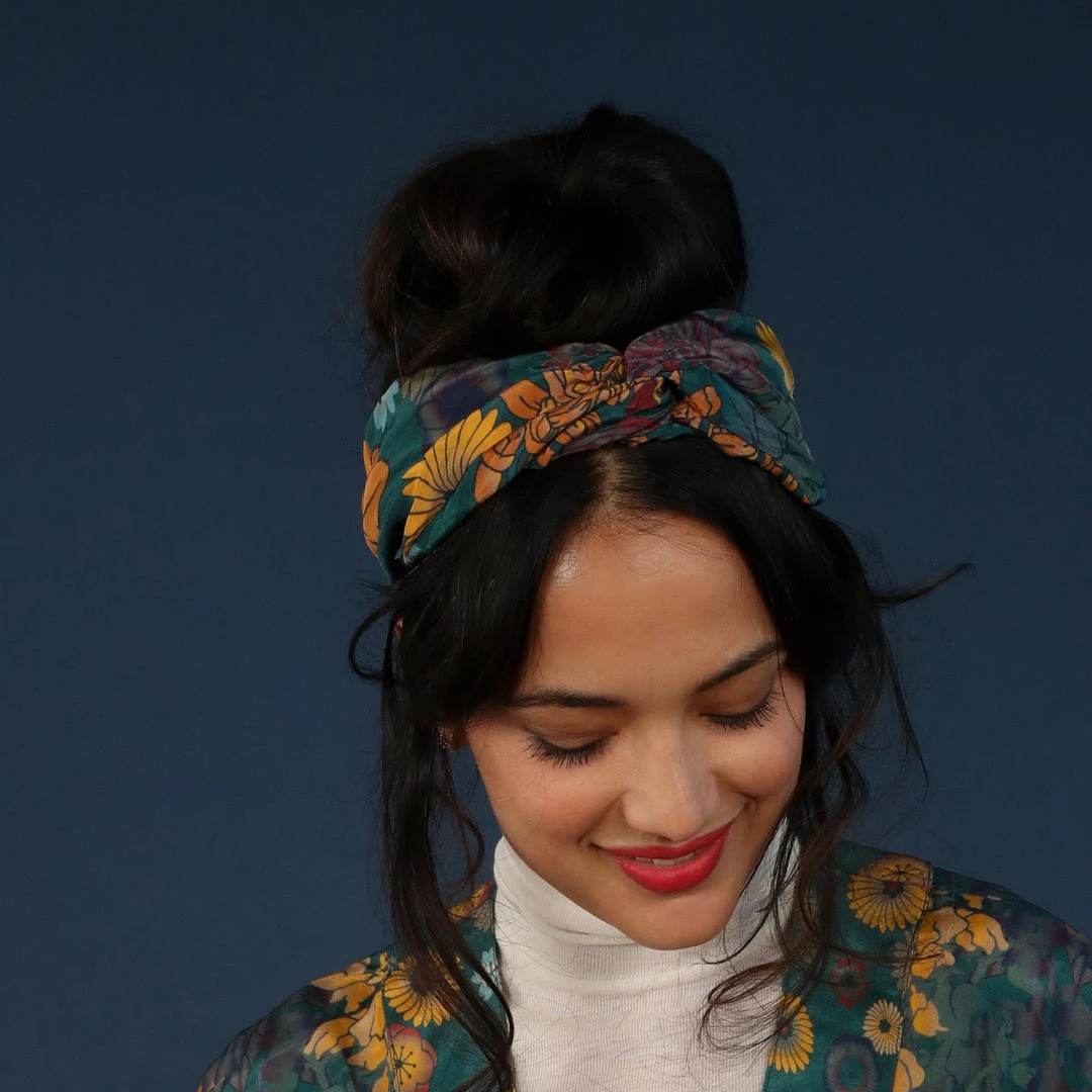 Teal Wisteria Elasticated Headband. Sweep that hair off your beautiful face! These Elasticated Headbands bring a high-end romantic look to any outfit. This headband has tones of teal green, yellow ochre and indigo.