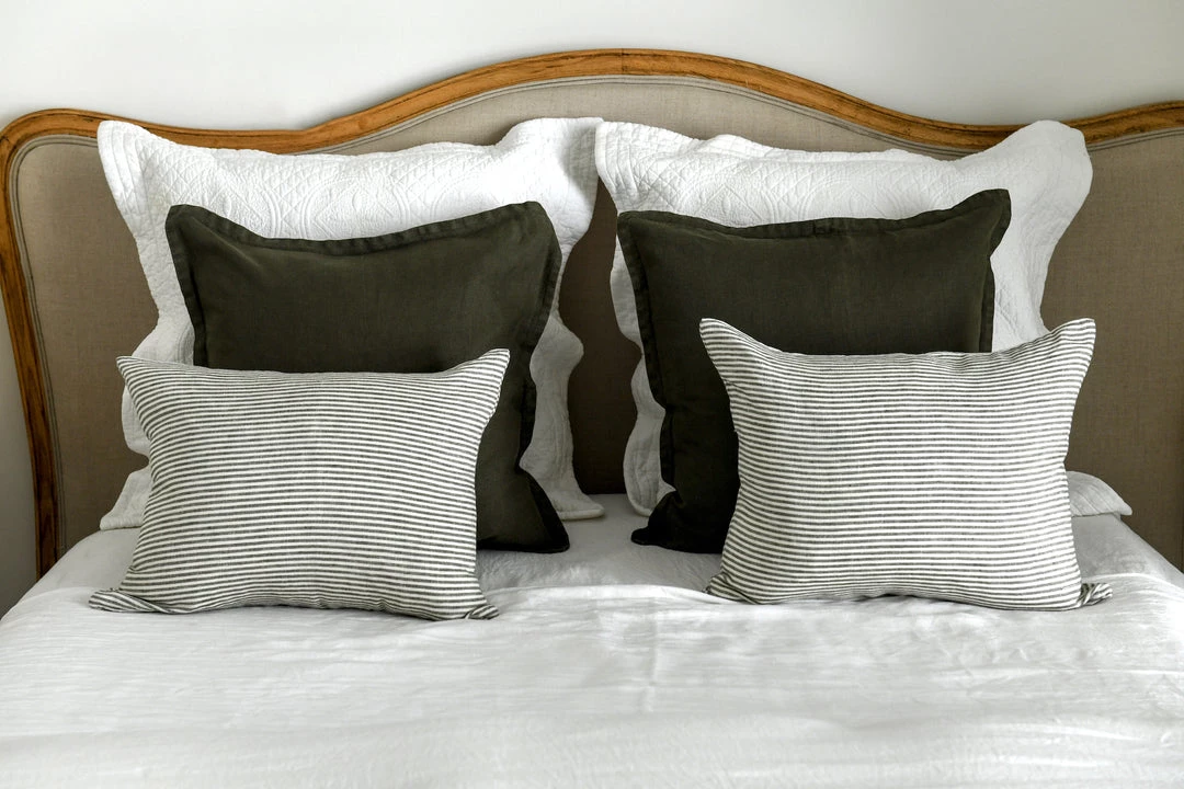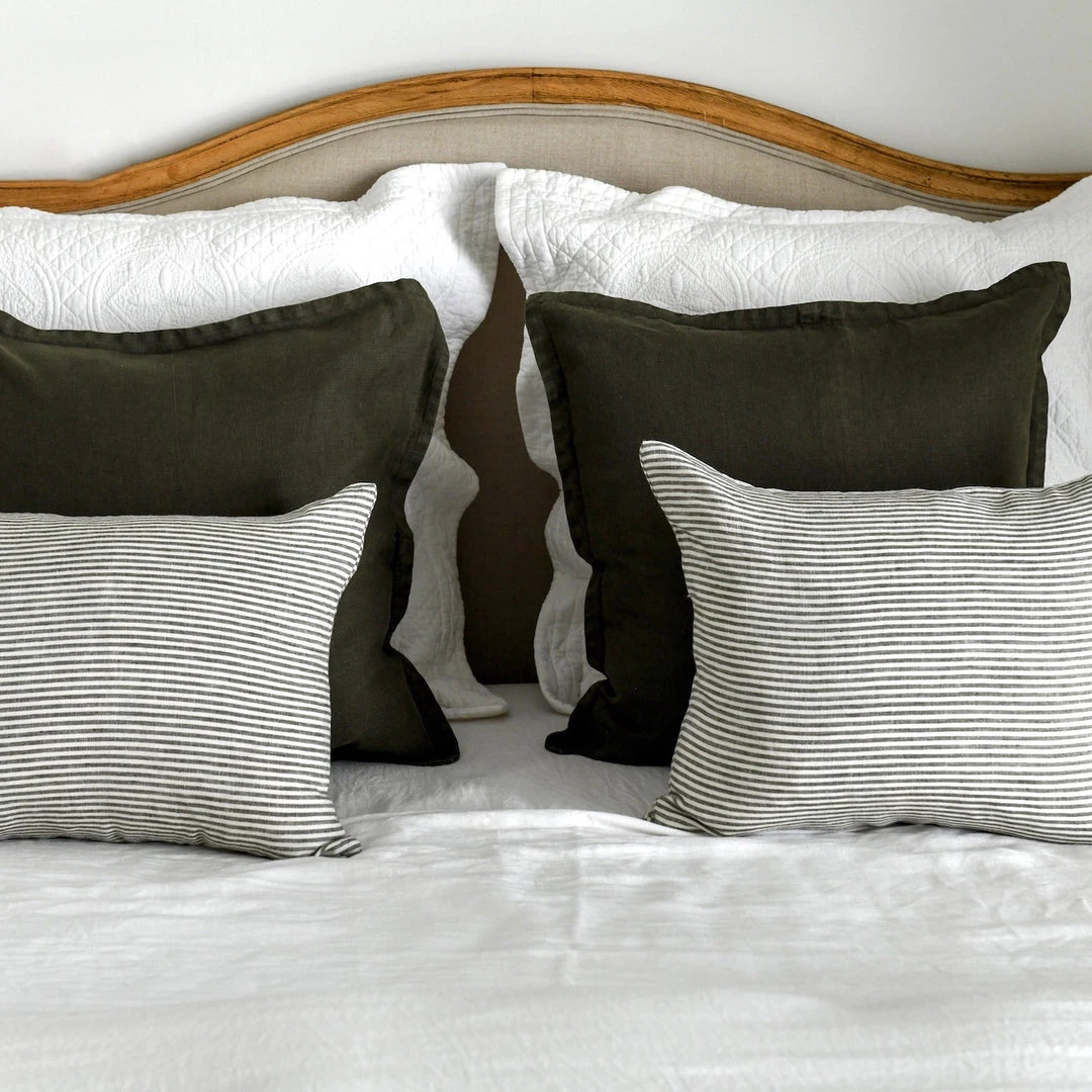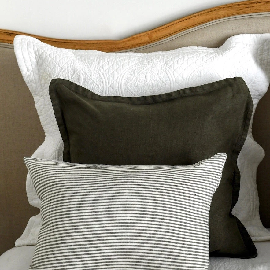 Classic linen cushion in dark olive green with Oxford trim. These elegant cushions come filled with a feather inner. Perfect for layering with other cushions, this timeless style will suit any room.