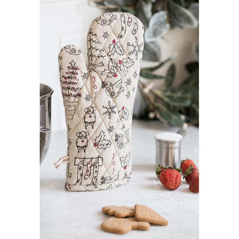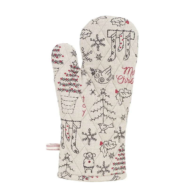 Oven Glove with Christmas Design. A festive oven glove made from 100% cotton with cotton wadding and screen printed with a lovely repeat Christmas design of Christmas trees, snowflakes, holly leaves, Rudolph, stockings, robins and cursive writing. Bring this playful and super Christmassy design out to bring some festive cheer to your kitchen. Perfect to use when baking all your Christmas goodies, when preparing your Christmas dinner or give as Christmas gift.