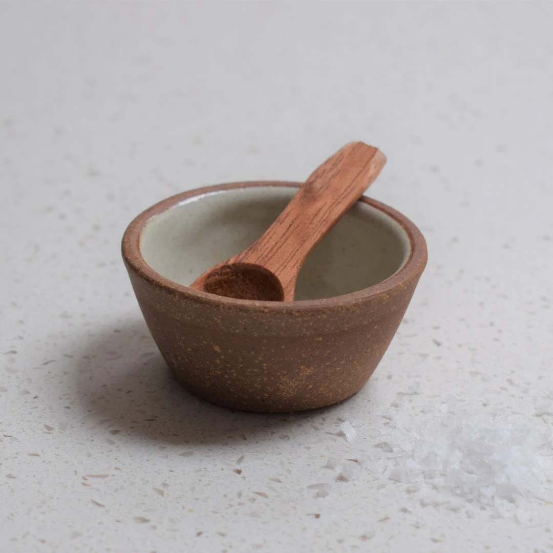 Stoneware Pinch Pot and Wooden Spoon. A small ceramic pinch pot with a wooden spoon. Glazed on the inside but unglazed on the outside. Perfect when in pairs for salt and pepper or for serving sauces. Simple, classic, practical designs that enhance your daily lifestyle and become pieces that will last a lifetime.