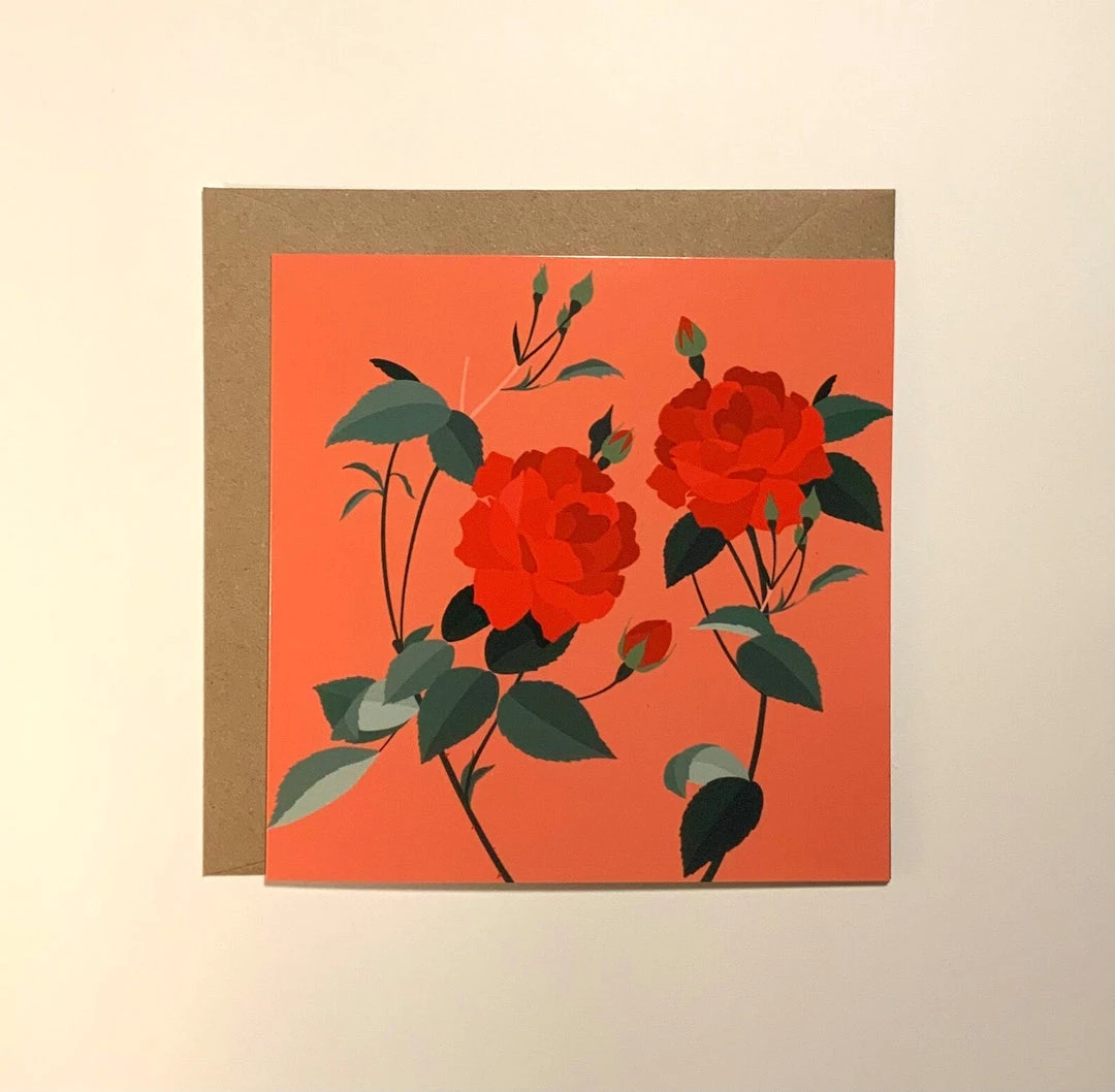 Red Roses on Orange greetings card designed in Herefordshire by Millie Boucher. Gloss coated, square greeting card includes a blank envelope to address to recipient. Blank on the inside for your own personal message.