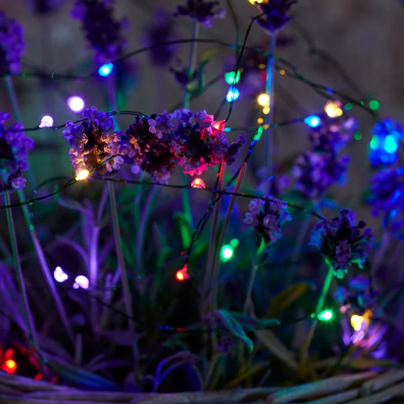 Micro multicoloured fairylight with an ultra fine transparent green wire that connects the 40 tiny little LED lights. Transform your garden into an atmospheric dell by dotting these lights amongst trees, bushes or pots.