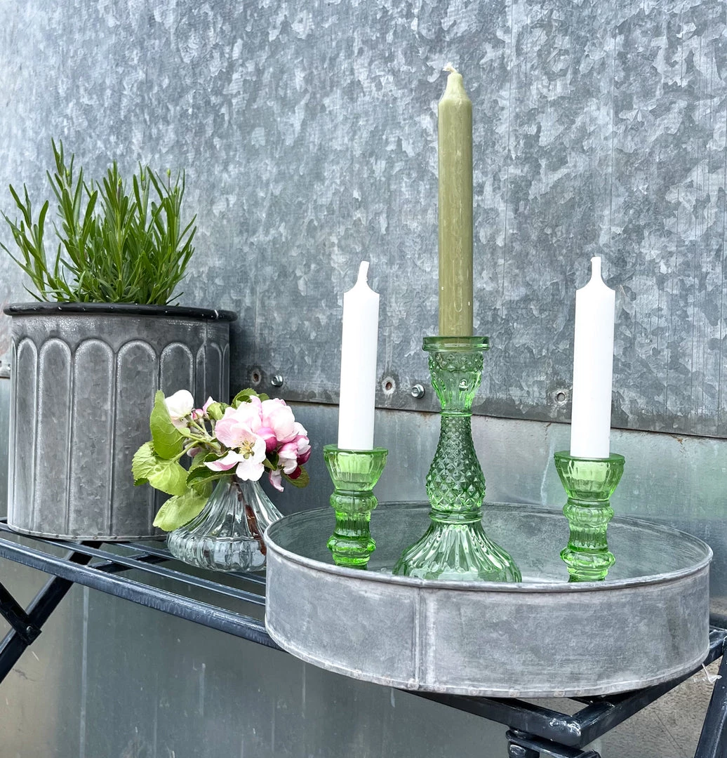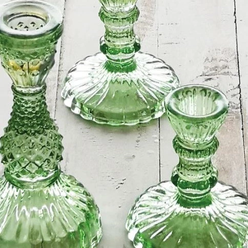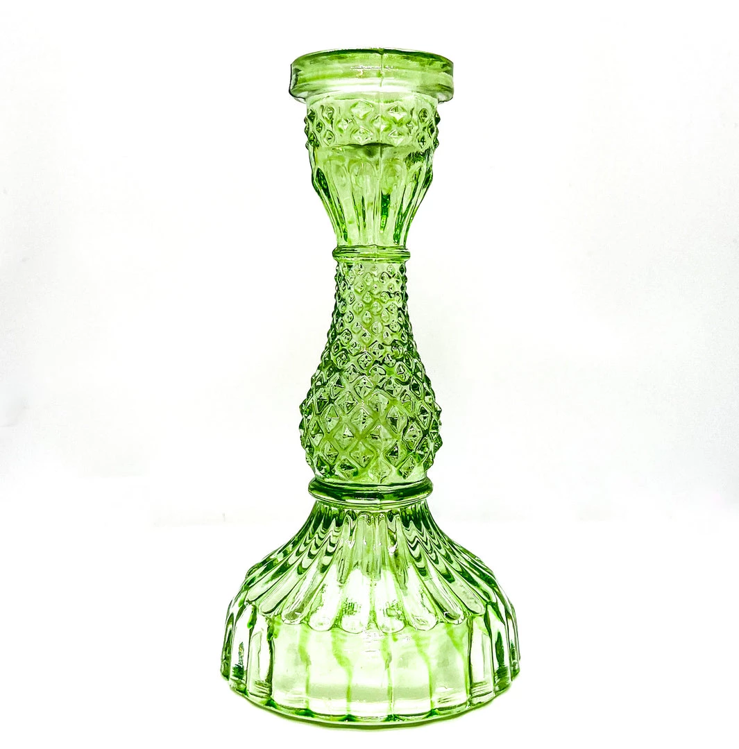 Large Pressed,Ā green glass candlestick.Ā A wonderfully elegant glass candle holder. This piece of glassware makes the perfect finishing touch to the dining tableĀ and its scale creates perfect lighting for cross table conversation. The beautiful cut glass design looks stunning in both candle and natural light.